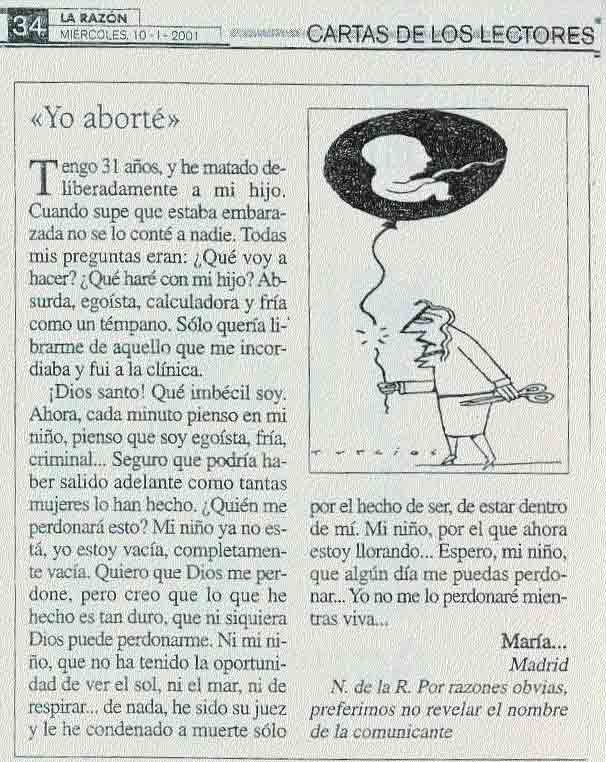 _______________________________________________________________________________ Salvamento en la peluquería (ver) _________________________________________________________________________________________ Carta de un padre a su hijo abortado Querido hijo: Al empezar a escribir estas líneas me asaltan las lágrimas, y también la alegría de hablar contigo. Por fin. Hace doce años. ¿Recuerdas?. Yo he estado intentando olvidar, intentando apartarte de mí, de mi vida. Sin saber que, para ello, tenía que adormecer, que anestesiar, que matar en definitiva, una parte de mí. La parte más bonita de un ser humano: la parte de nosotros que ama, que se emociona, que se ríe, que se alegra, que ve el futuro con esperanza y optimismo. Esa parte de mí quedó cubierta por una especie de nube negra el día que me faltaste y decidí que “mejor no hablar de ello y tirar para adelante”. _________________________________________________________________________________________ "Yo quise abortar por mi situación" Carta al Director. 28-01-08.- Tengo 25 años y, después de un camino largo, me di cuenta de que estaba embarazada. Fue un embarazo inesperado, y un test me lo confirmó. Yo quise abortar. ¿No querría yo a mi niño? Claro que sí, como todas las madres; pero yo tenía apuros y decía: "no lo voy a guardar", "no lo quiero", "no necesito un niño". Yo estaba trabajando pero mi marido no, y por esto no lo quería; no teníamos una situación buena, teníamos una habitación en alquiler y después íbamos a quedarnos en la calle. Una buena gente me abrió los ojos y por eso pensé y decidí guardarlo. Hemos alquilado un piso donde vivimos ahora. Fui para hacer los primeros análisis, las primeras ecografías y le oí el corazón. Me dio emociones. Ahora tengo una maravilla de niño. No puedo vivir sin él. Soy feliz mirando a mi peque._________________________________________________________________________________________ Arrepentida tras dos abortos, quiere llevar flores a sus hijos ________________________________________________________________________________________ "Fui violada y quedé embarazada a los 16..., pero amo a mi bebé" El periódico Daily Mail recogió el impactante testimonio de Elizabeth Cameron, una joven de 19 años que resultó embrazada tras una salvaje violación, pese a las presiones de su entorno decidió tener a su bebé y hoy asegura que nunca se arrepentirá de haber optado por la vida de su hija. ño. Me arrepiento por lo malo que estaba pensando de matar una vida. Le estoy mirando y no lo puedo creer. Mi niño es un regalo de Dios.Fuente: Forum Libertas.com y Diario Metro - 28-01-08 LONDRES, 21 Ago. 08 (ACI).- En diciembre de 2005, Elizabeth tenía 16 años de edad, era una chica estudiosa y tímida. Una noche después de clases mientras esperaba que su madre la recogiera de su centro estudios, tres encapuchados la metieron en una camioneta por la fuerza y la violaron. Nunca pudo reconocerlos. Cuando supo que estaba embarazada, el sufrimiento aumentó. "Todo el mundo, salvo mi mamá, decía que debía tener un aborto. Mi papá incluso concertó una cita en la clínica, ahí trataron de convencerme de que era sólo una masa de células y que todo sería muy rápido", recuerda Elizabeth. "En la escuela, mis amigos –la mayoría de los cuales no sabía de la violación– no podían entender por qué alguien de mi edad querría tener un bebé en vez de un aborto. Y los pocos a los que conté lo sucedido se horrorizaban más al saber que pretendía tener al bebé. Pero yo lo hice. Y no me arrepiento ni por un momento", asegura la joven. "Cada vez que miro a Phoebe, sé que tomé la decisión correcta. Nunca quise poner fin a la vida de mi bebé sólo por la forma en que fue concebida", indicó. Según el reportaje del Daily Mail, Elizabeth alguna vez compartió la idea de que dar a luz al hijo de un violador es impensable, pero desde que vio a su bebé en el primer ultrasonido sintió mucha ternura. "Me sorprende lo fácil que surgió el amor por mi hija mientras crecía dentro de mí, pero debo admitir que temía que mis sentimientos cambiaran cuando la viera por primera vez", recuerda la joven. Elizabeth sostiene que durante el embarazo tuvo muchas pesadillas sobre el ataque y pensaba que al tener al bebé recordaría más la violación. "Pero ella no me recordó esa noche y al tenerla supe que estar con ella era más importante que lo que había ocurrido", sostiene. "No pude considerar entregarla en adopción. Mi madre fue abandonada de bebé en una estación de trenes de Londres y eso la afectó mucho. Crecí rechazando que alguien pudiera abandonar a un niño inocente", agregó. La madre de Elizabeth apoya en todo a su hija. "La gente puede pensar que no es posible amar a un niño concebido de esa forma, pero créanme, la amo más justamente por eso", sostiene la abuela. Elizabeth agrega: "Nunca he culpado a Phoebe por lo ocurrido. Aunque lo ocurrido fue aterrador, saber que iba a ser madre me ayudó a concentrarme en otra cosa. Supuse que debía tratar de ver más allá de lo ocurrido, y ver la vida que se había creado". Phoebe tiene casi dos años y a Elizabeth le costó mucho reconciliarse con su padre por intentar hacerla abortar. "Ahora él la ama y eso es lo importante. Sé que necesita una figura paterna en su vida", asegura Elizabeth. Elizabeth se prepara para el momento en que su hija crezca y le pregunte por su padre: "Si debo hacerlo, le diré que ella fue lo bueno que surgió de algo malo. Y le diré que nunca me arrepentí de tenerla y que no estaría lejos de ella por nada del mundo". Otro testimonio de embarazo por violación (Chile) Esta es la transcripción del testimonio de una joven de 17 años, que fue violada a los 13, prestada ayer en el juicio público contra el violador. Quise respetar lo más posible la integridad de las palabras, así que espero disculpen los chilenismos. (ver Infocatólica). El psicólogo me preguntó qué me p